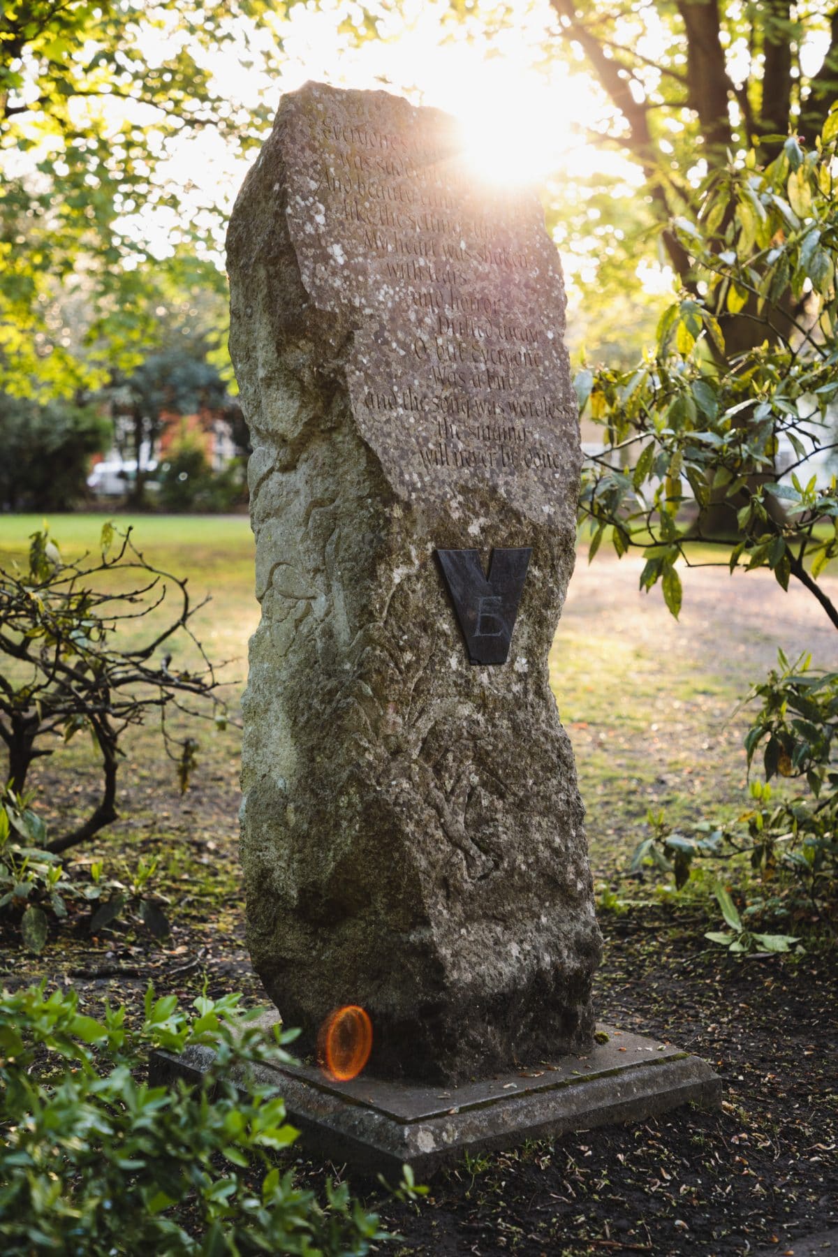 ‘Someone stole the original statue, in place since World War I, in 2004. After recovery and restoration it went into storage with a fibre-glass replica going back into the gardens. The 2ft statue sits on a stone cairn.’