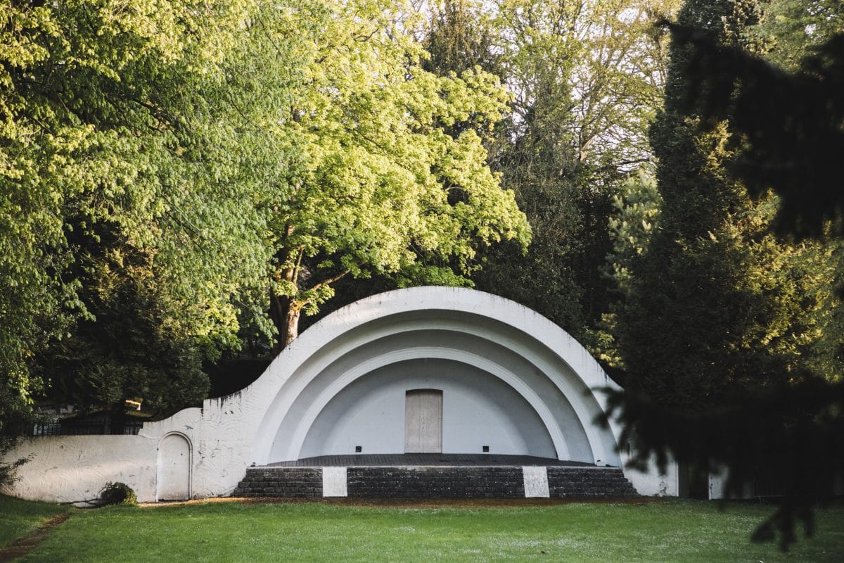 The Concert Bowl, referred to in Thompson’s drawings as ‘Bandstand and Arena’, and in Civic News, July 1963, as ‘a concert bowl and shell’, stands 65m south of the north-eastern entrance. It’s approached from the south along a lawn at the bottom of the steep grass-banked valley, with mature trees to the north, west, and east….’
