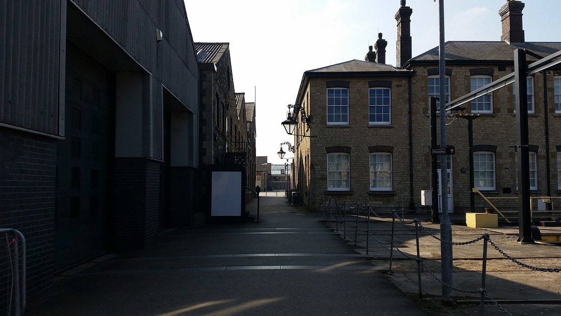 The tunnel emerges north of the railway line at the western end of the general offices building. Until 1922, an early 20th century extension of the subway continued northwards under the office block to an open junction in the yard behind. From there it continued, by tunnel, to the general stores building beyond the Gloucester line.