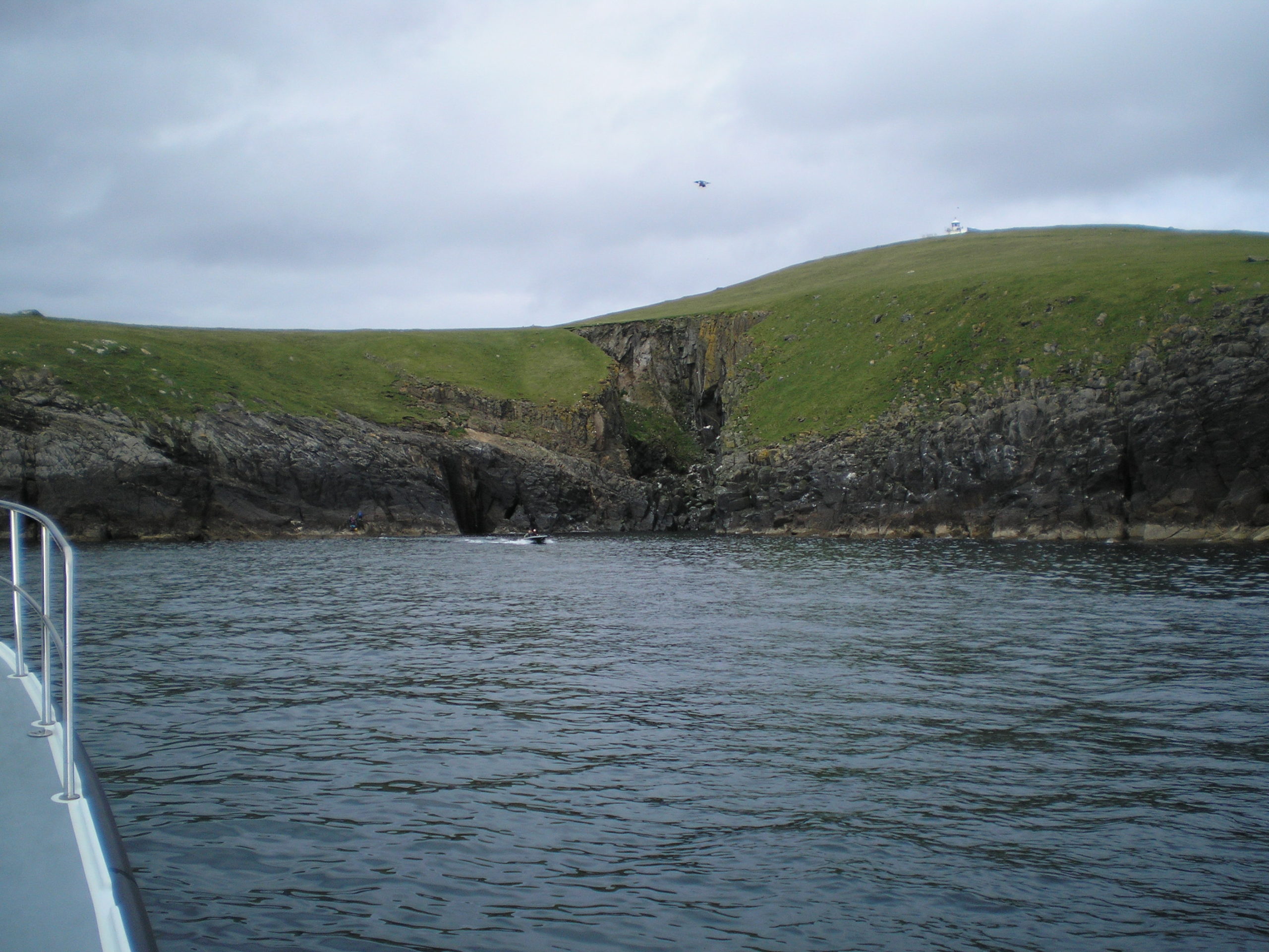Now below is the proof that your lubberly scholar has indeed in her life been to sea, nay, experienced the real ocean; North Rona, which is further away than St Kilda. Our skipper is scouting out the landing. Never mind it looks like a cliff. (It is a cliff…) This is the landing. Oh what have I let myself in for?