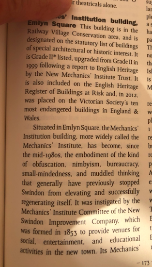 The image below is an extract from Mark Child’s Swindon Book. It’s taken from his entry in his book about the Mechanics’ Institution. But really – one could change the words ‘Mechanics’ Institution’ to pretty much any heritage asset you care to name and the same would apply – with this heritage asset in particular. As someone on Facebook observed, (I’m paraphrasing) though SBC do not and have not, ever owned the corn exchange, they have still managed to put every conceivable obstruction in the path of those trying to do something with it. Steve Rosier (now recently deceased) for one. And again I refer you to the Swindon Book for more on that – you’ll find it in the library – to either borrow or to buy.