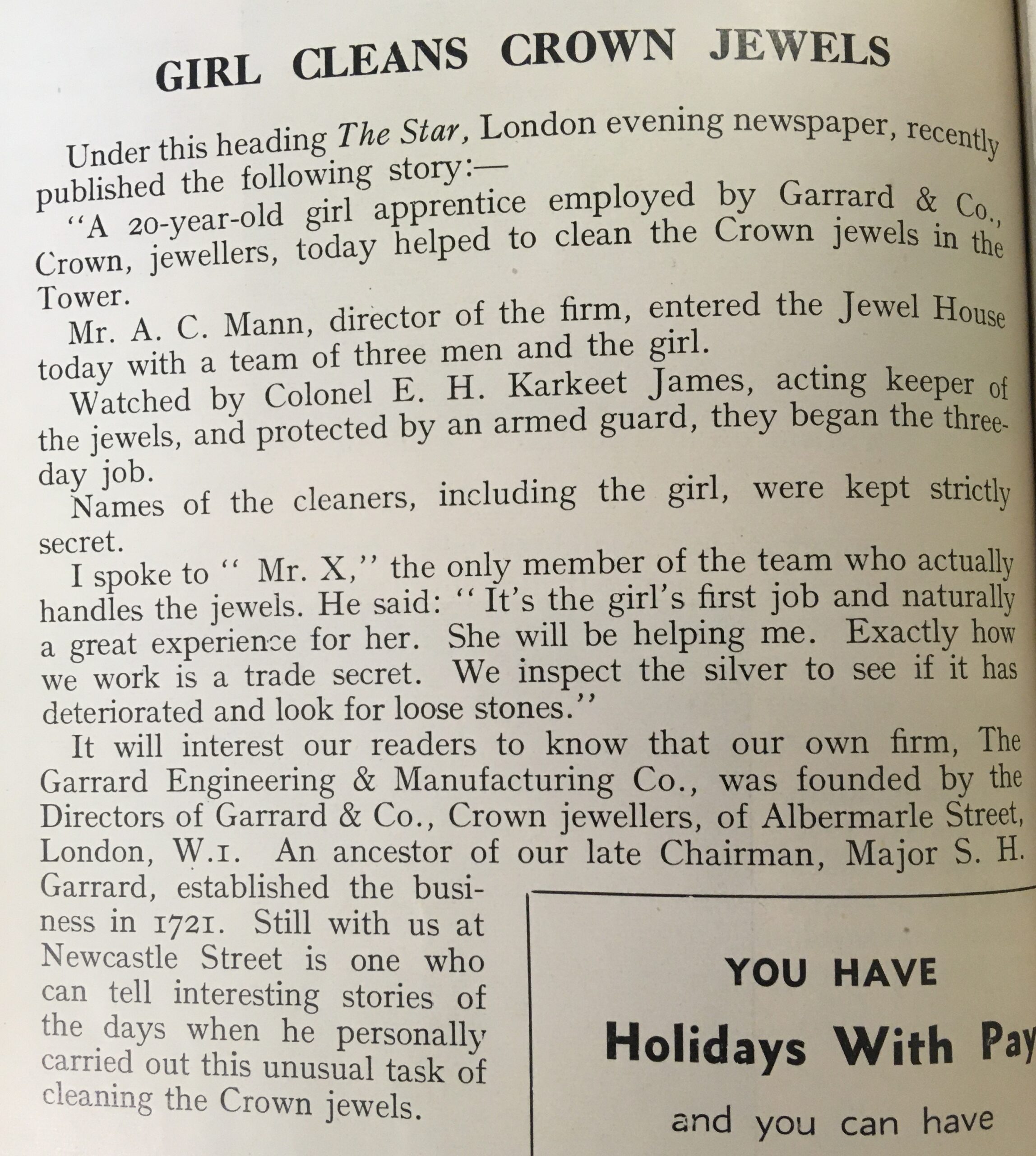 I love the fact that the founders of the Garrard Engineering & Manufacturing Co. were none other than the directors of Garrard & Co., Crown Jewellers of Albermarle Street, London. The image you see below is an extract from a Garrard journal – courtesy of Local Studies. Quite how and why Crown jewellers decided to make the leap from rubies to record decks is an intriguing one to ponder. One assumes the aforementioned possibilities of the gramophone motor market.