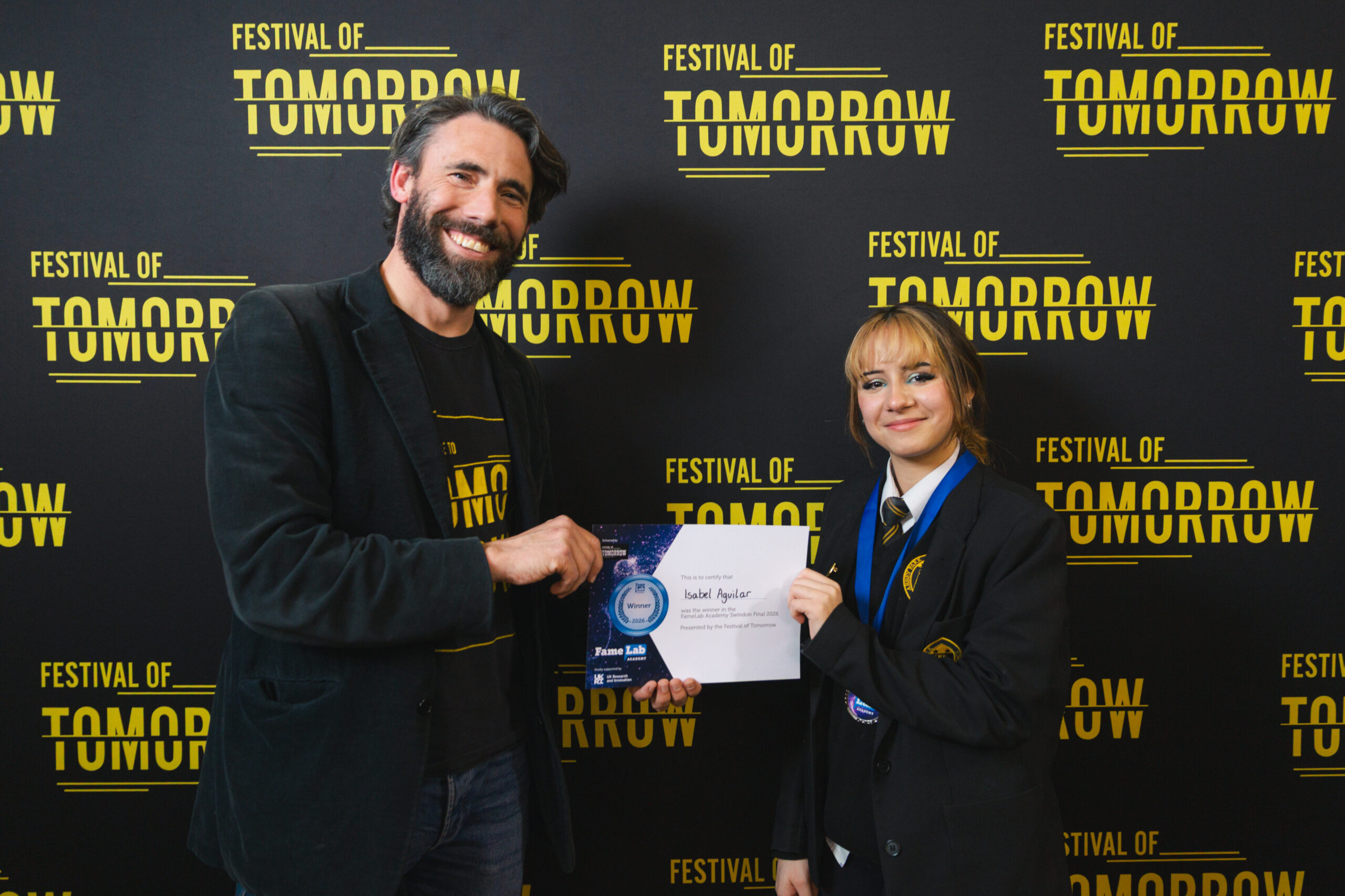 Isabel Aguilar found herself chosen as the winner of the first ever FameLab Academy Swindon. It took place on Friday 20 March, in the final event of the Festival of Tomorrow 2026 Schools Programme. This year it reached more Swindon students than ever before. Isabel – a year 9 student from Abbey Park School – amazed the judges with her talk, ‘Echos of the Mind’, that explored the neuroscience of déjà vu.